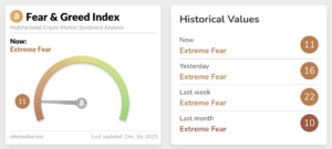 The index — a widely followed gauge of market psychology that ranges from 0 (extreme fear) to 100 (extreme greed)— fell from higher readings earlier in the week as volatility and risk aversion intensified across crypto markets. At an 11 reading, the sentiment climate suggests that many market participants are fearful, risk-averse and reluctant to deploy capital.